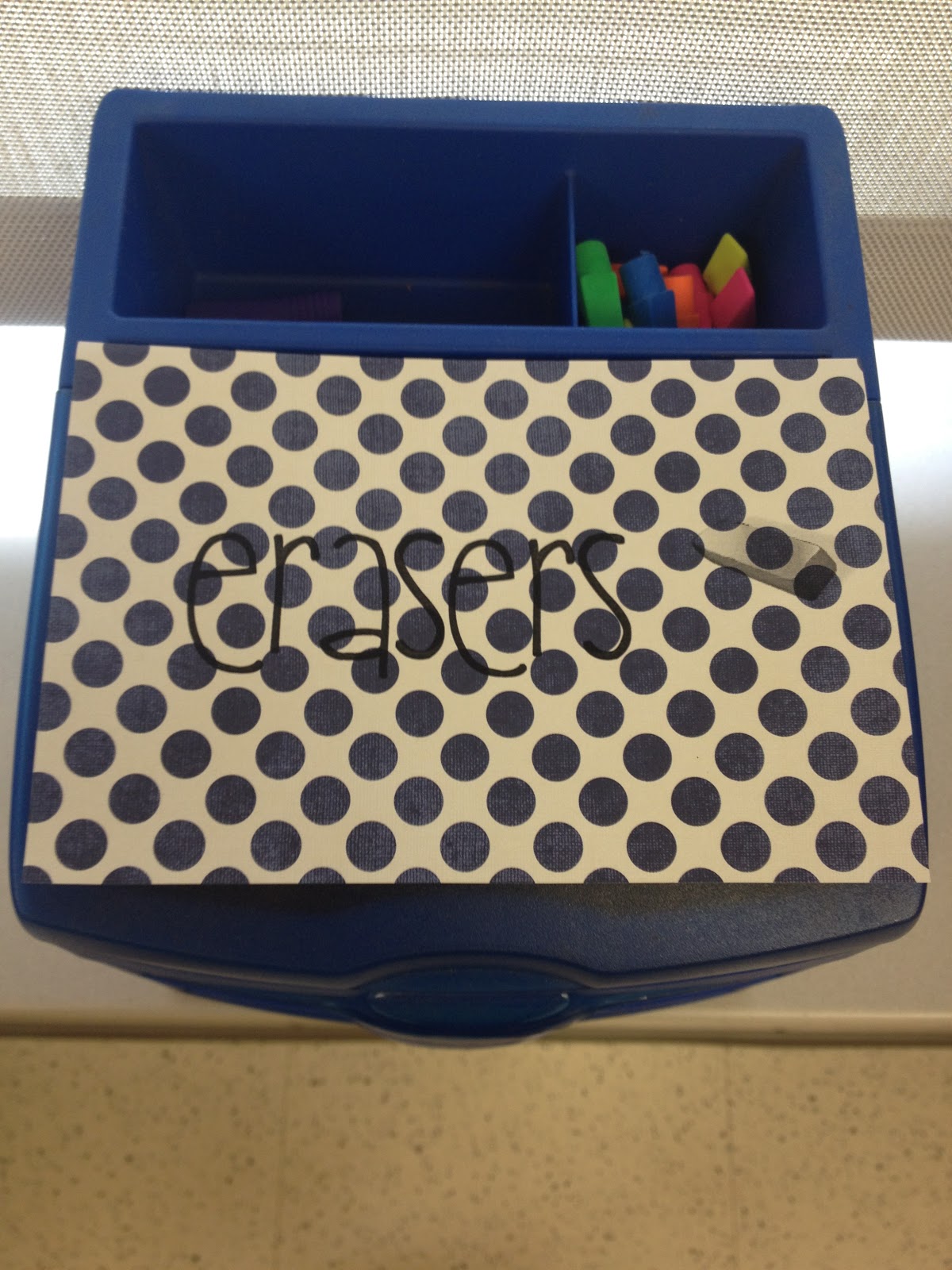 Simple. Just two drawers- one labeled "Pencil Hospital" and one labeled "Ready Pencils." The top will have plenty of erasers for when the pencils are fine, but the erasers are worn out. As you can see in the last picture, the cute scrapbook paper I chose to print on is too busy and dark to be able to read the words clearly, so I will be finding a new design to print on. I will update with pictures when I find the perfect paper.